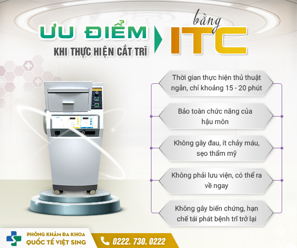 Phương pháp ITC tại Việt Sing là kỹ thuật hiện đại, sử dụng sóng cao tần tác động trực tiếp lên búi trĩ, giúp đông mạch máu, làm khô và loại bỏ búi trĩ mà không cần dao mổ.