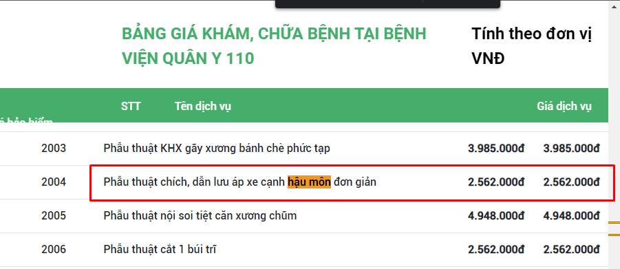 – Tại bệnh viện Quân y 110, chi phí phẫu thuật chích dẫn lưu apxe hậu môn từ 2.562.000Đ (chưa bao gồm chi phí thuốc men, bông băng, vật tư y tế, thiết bị y tế hỗ trợ phẫu thuật…)