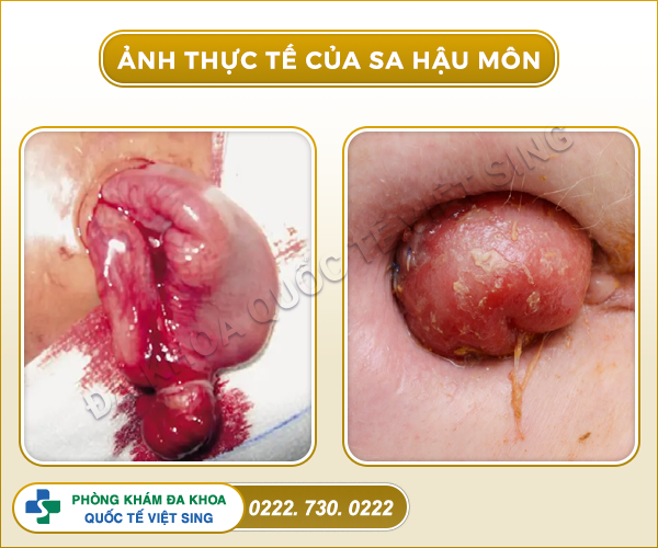- Hậu môn xuất hiện khối sa: lúc đầu khối sa nhỏ, độ sa ít, khối sa chỉ lộ khi dùng sức rặn rồi tự thụt vào. Tuy nhiên, theo thời gian mức độ sa ngày một nhiều, kích thước khối sa ngày một to thì chỉ cần đi lại, ngồi xổm, ho, hắt hơi là khối sa lại xuất hiện và không thể đẩy lên.