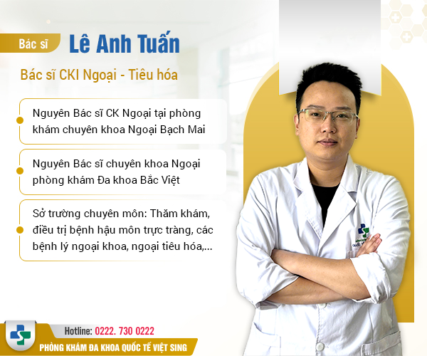 - Bác sĩ CKI Lê Anh Tuấn: Bác sĩ chuyên khoa I Ngoại – Tiêu hóa, bác sĩ Tuấn có đầy đủ chuyên môn, kinh nghiệm trong việc tư vấn và khám chữa các bệnh lý hậu môn, đặc biệt là bệnh trĩ với tỷ lệ thành công cao, được nhiều bệnh nhân tin tưởng.