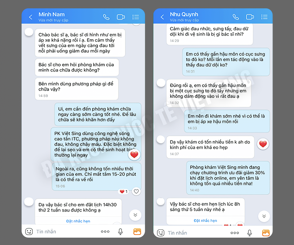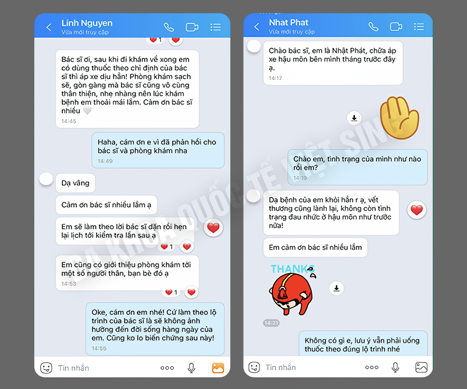 - Chị Phương T. đánh giá: “Mình khá ngại khi bị áp xe hậu môn, bởi đây là một vị trí khá nhạy cảm. Nhưng may quá, mình tìm được phòng khám Việt Sing, chữa bệnh 1-1 với bác sĩ nên mọi thứ diễn ra khá riêng tư. Dụng cụ y tế với không gian ở đây cũng được bảo quản vệ sinh rất sạch sẽ. Mình rất hài lòng về dịch vụ khám chữa bệnh cũng như điều trị bệnh tại Việt Sing.”