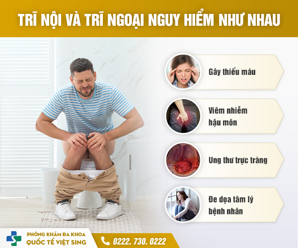 Theo chuyên gia hậu môn trực tràng, cả trĩ nội, trĩ ngoại và trĩ hỗn hợp đều nguy hiểm như nhau. Nếu không thăm khám, điều trị kịp thời, có thể dẫn tới biến chứng khó lường như ung thư đại trực tràng.