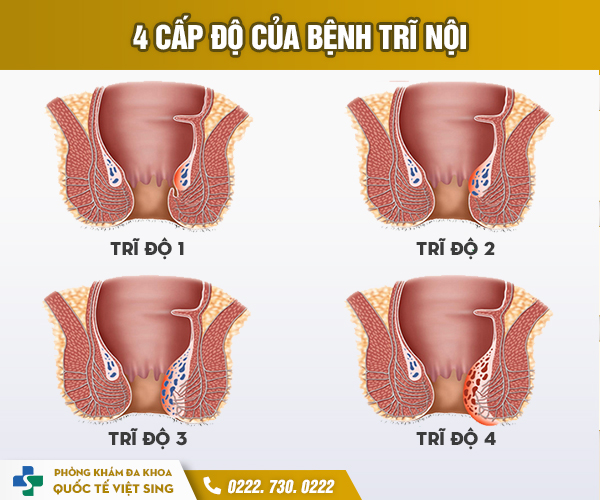 Tùy vào mức độ nặng nhẹ, bệnh trĩ nội được phân thành 4 độ: Bệnh trĩ nội độ 1, bệnh trĩ nội độ 2, bệnh trĩ nội độ 3 và bệnh trĩ nội độ 4. Cụ thể: