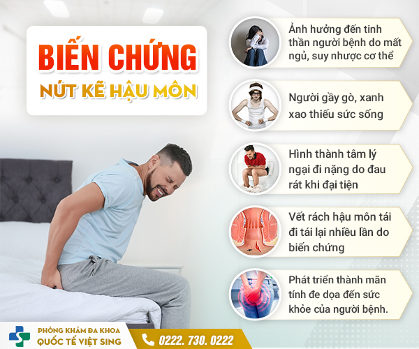 - Biến chứng áp xe hậu môn: Vết nứt lan vào cơ vòng hậu môn rất khó lành, tăng nguy cơ nhiễm trùng hậu môn, nứt kẽ hậu môn để lâu thành mãn tính có thể gây thiếu máu và đối mặt với các biến chứng nghiêm trọng như áp xe hậu môn, viêm nhiễm hậu môn…